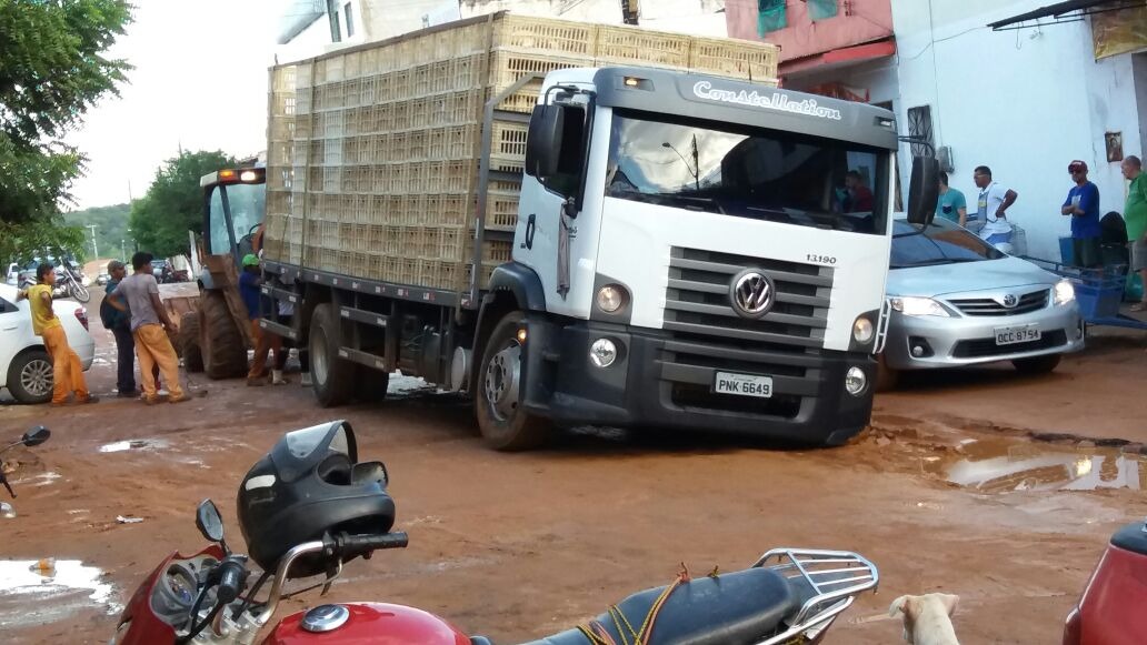 localidade, é possível ver carros e caminhões caídos em buracos e poços de