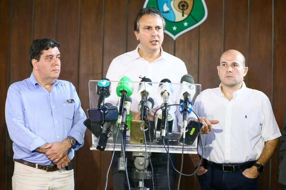 | O secretário da Saúde do Ceará, Dr. Cabeto, o governador Camilo Santana e o prefeito de Fortaleza, Roberto Claudio |