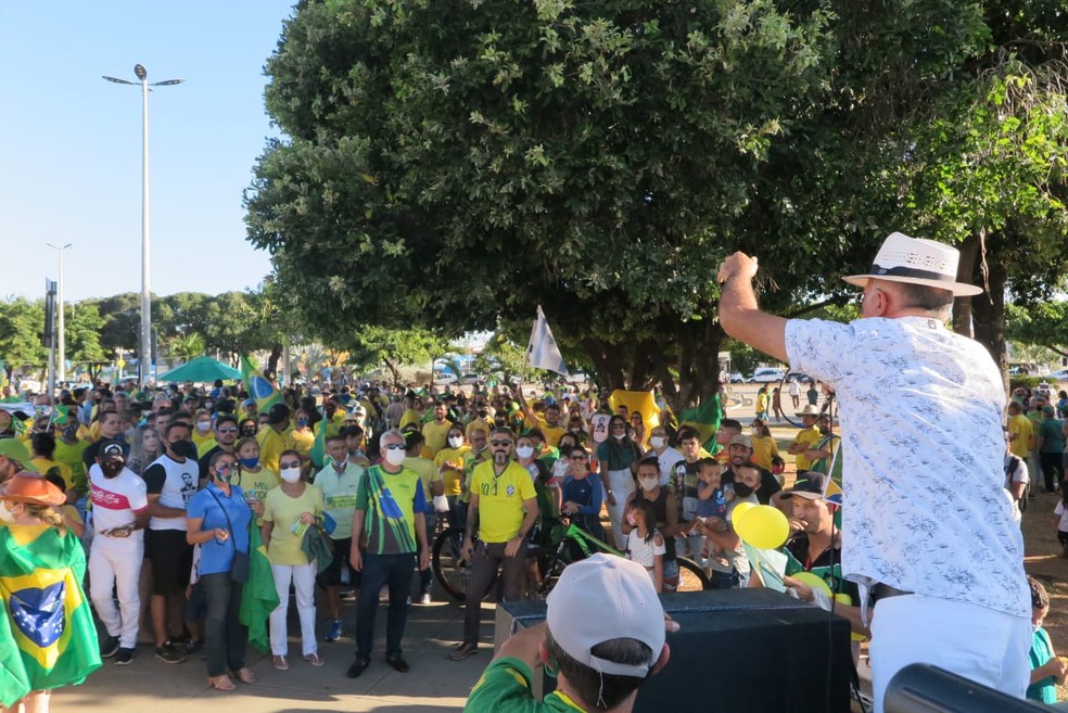 Manifestantes com e sem máscara, vestidos de verde e amarelo, chegaram à concentração do ato ainda antes das 8h. Pessoas a pé, em motos, carros e bicicletas se reuniram nas laterais do estádio. Na concentração, os participantes cantaram o hino nacional, tocaram um berrante e se organizaram para a saída da carreata.